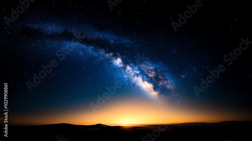 © Atchariya63, Fototapeta premium Vibrant night sky with stars and Milky Way galaxy illuminated by horizon glow.
