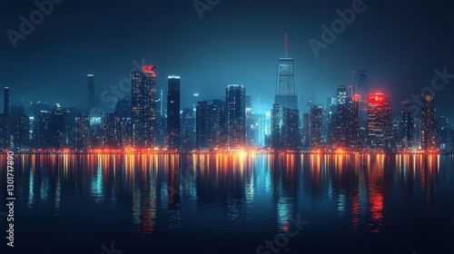 Fototapeta premium Vibrant night skyline over water with city lights reflections