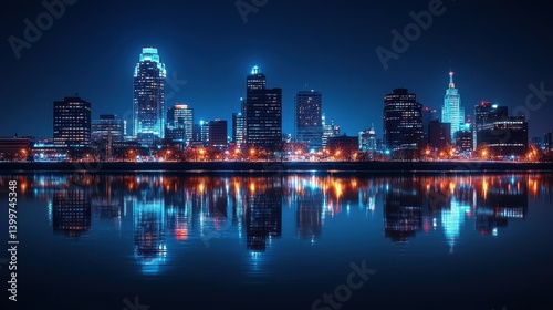 Naklejka premium Vibrant night skyline reflecting over water with bright city lights