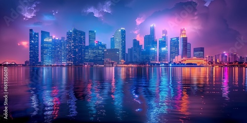 Fototapeta premium Vibrant Night Skyline with Reflections. Vibrant city skyline illuminated at...