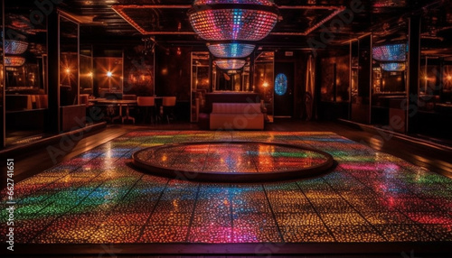 Obraz premium Vibrant nightclub with modern design, illuminated by multi colored lighting equipment generated by AI