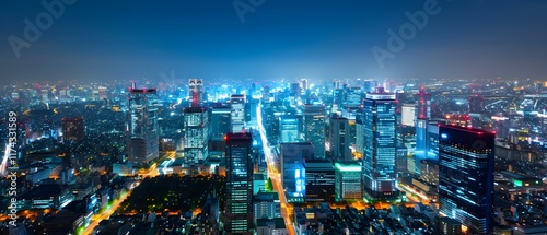 Fototapeta premium Vibrant Nightscape of a Modern City Skyline Illuminated by Urban Lights from a High Perspective