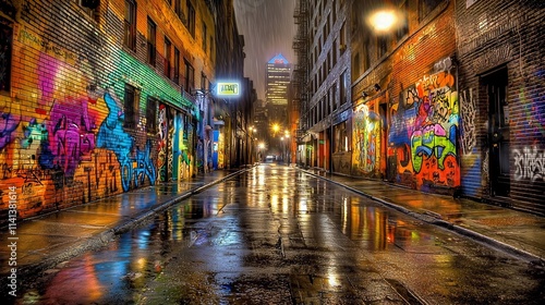 © Rudsaphon, Naklejka premium Vibrant Nighttime Alley with Colorful Graffiti Art and Wet Pavement Reflections