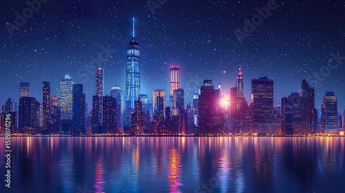 © Thanthara, Fototapeta premium vibrant nighttime city skyline glows under starry sky, reflecting on water