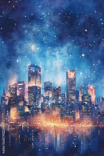 © Jeeranun, Obraz premium Vibrant Nighttime Cityscape Under Starry Sky in Watercolor Style