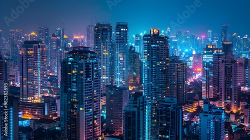 © Bussakon, Fototapeta premium Vibrant Nighttime Cityscape with Colorfully Illuminated Skyscrapers and Towering Structures