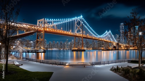 © Kobkaew, Naklejka premium Vibrant nighttime cityscape with illuminated bridge waterfront photography urban aesthetic