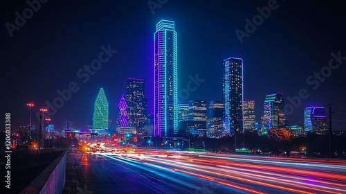 Fototapeta premium Vibrant nighttime cityscape with illuminated skyscrapers and light trails on...