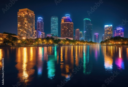 Naklejka premium vibrant nighttime view featuring tranquil reflections water surfaces colorful lights scenic landscapes, cityscape, skyline, nightview, colors, scenery