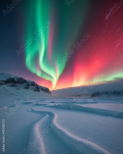 © Den Boro Day, Naklejka premium Vibrant northern lights illuminate snowy Arctic landscape at night