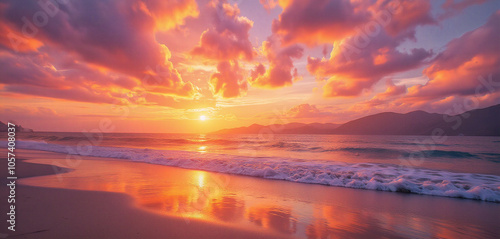 Naklejka premium Vibrant Ocean Sunset with Dramatic Sky and Reflective Water