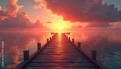 Fototapeta premium Vibrant Ocean Sunset with Illuminated Wooden Pier and Reflective Waters