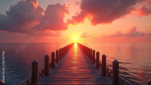 Fototapeta premium Vibrant Ocean Sunset with Illuminated Wooden Pier and Reflective Waters