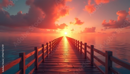 © DesignBee, Obraz premium Vibrant Ocean Sunset with Illuminated Wooden Pier and Reflective Waters