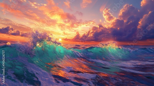 © NawasenaRid, Fototapeta premium Vibrant Ocean Waves at Sunset with Colorful Sky