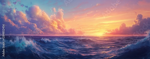 Fototapeta premium Vibrant ocean waves at sunset with dramatic clouds in a colorful sky