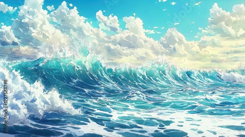 © Nattapol, Fototapeta premium Vibrant ocean waves under a bright blue sky.