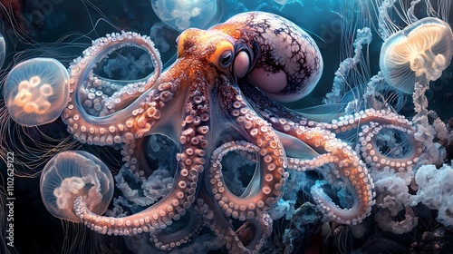 Obraz premium Vibrant Octopus Swimming Gracefully Among Luminescent Jellyfish in a Deep...