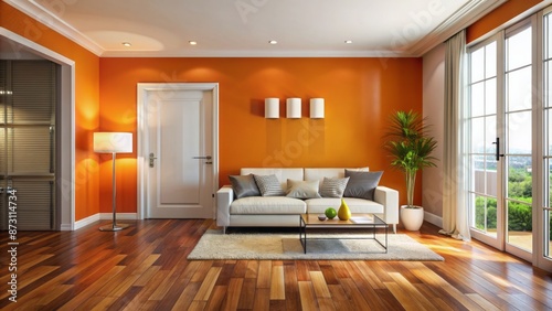 Fototapeta premium Vibrant orange accent wall complements modern living room with white door,...