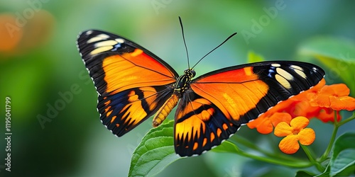 Fototapeta premium Vibrant orange and black butterfly perched on bright orange flowers surrounded by lush green foliage with soft blurred background elements