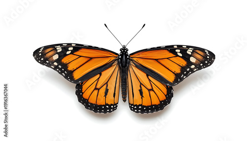 Obraz premium Vibrant orange and black monarch butterfly in flight pose against white...