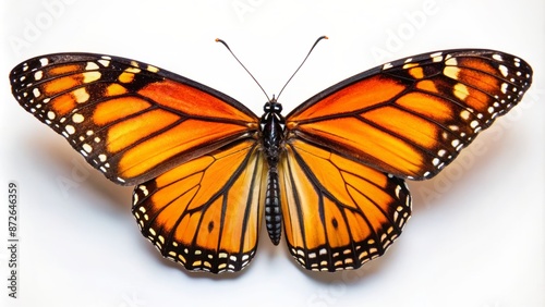 Fototapeta premium Vibrant orange and black monarch butterfly with delicate wings and slender body perched on a pristine white background alone.