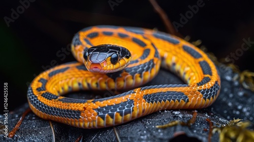 © Tina, Obraz premium Vibrant orange and black snake coiled on a dark leaf in a lush, tropical environment