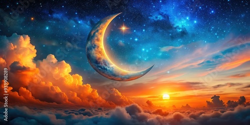 Fototapeta premium Vibrant orange and blue hues illuminate the Ramadan night sky, featuring a majestic crescent moon, stars, and galaxy clouds, symbolizing hope and spirituality.