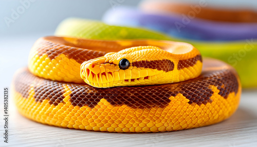 © Nadiyah, Obraz premium Vibrant orange and brown snake coiled on white surface, blurred colorful snakes in background. Generative AI