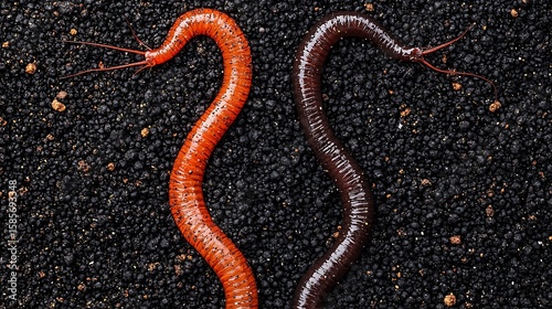 © Ravanas Arts, Fototapeta premium Vibrant Orange and Brown Worms on Dark Soil