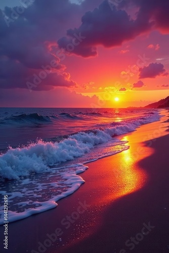 Naklejka premium Vibrant orange and purple sunset over calm ocean waves, sandy beach ,...