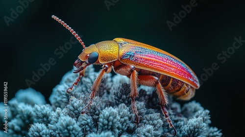 Fototapeta premium Vibrant orange and red beetle on grey lichen, close-up.