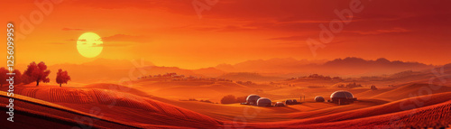 Obraz premium Vibrant orange and red sunset over futuristic farms on terraced hills