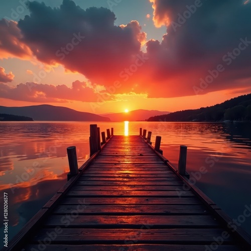 © Kanyapat, Fototapeta premium Vibrant orange and red sunset reflected in wet dock wood grain , vertical, orange, colors