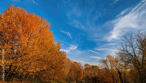 Fototapeta premium Vibrant orange and yellow autumn leaves set against a calm blue sky backdrop