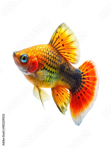Fototapeta premium Vibrant orange and yellow guppy fish with detailed scales and fins isolated...