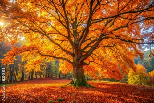 © Adisorn, Fototapeta premium Vibrant orange and yellow leaves adorn a majestic autumn tree standing alone in a serene forest, surrounded by a carpet of fallen foliage.
