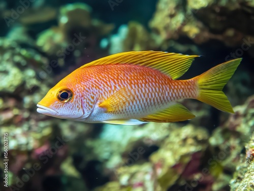 Naklejka premium Vibrant orange and yellow striped fish swimming in clear water isolated on...