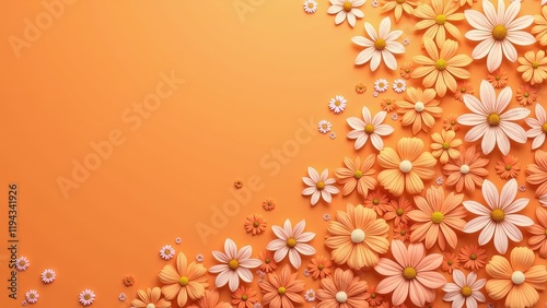 © AiPhotoSale, Naklejka premium Vibrant orange backdrop adorned with handcrafted paper quilled daisies, featuring orange and white petals with golden centers, elegantly cascading across the frame