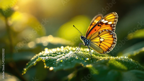 © O, Obraz premium Vibrant orange butterfly resting on dew-covered leaf in sunlit garden