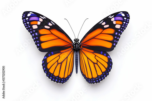 © Mohan, Fototapeta premium Vibrant orange butterfly with black and purple markings, isolated on white background