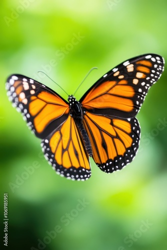 © Mandeep, Fototapeta premium Vibrant orange butterfly with black and white markings resting on a blurred green background