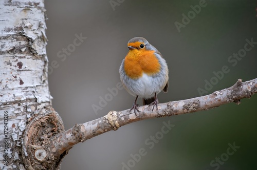 © TheWaterMeloonProjec, Fototapeta premium Vibrant orange-chested bird sitting on a peeling birch limb.