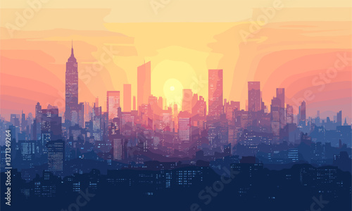 © Farid, Fototapeta premium Vibrant orange cityscape at sunset with silhouetted skyline - vector