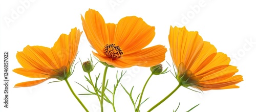 © StockKing, Fototapeta premium Vibrant orange cosmos flowers with delicate green stems arranged in a triangular formation against a clean white background
