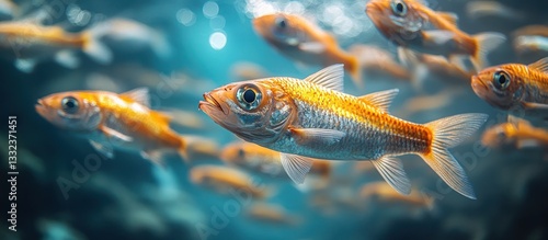 Fototapeta premium Vibrant orange fish school swimming underwater.