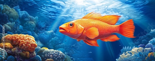 Naklejka premium Vibrant orange fish swim in an underwater scene illuminated by sunlight