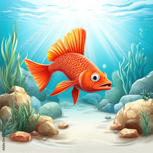 Naklejka premium Vibrant orange fish swimming in sunlit ocean, surrounded by rocks and seaweed