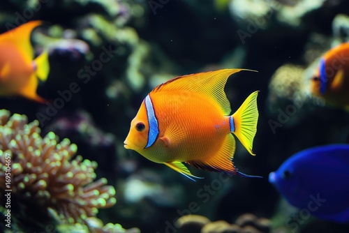 © Art, Naklejka premium Vibrant orange fish with blue stripes swims in a coral reef aquarium.