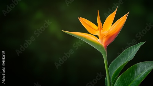 © Paul GoToMars, Obraz premium Vibrant orange flower with green leaves on a blurred background.